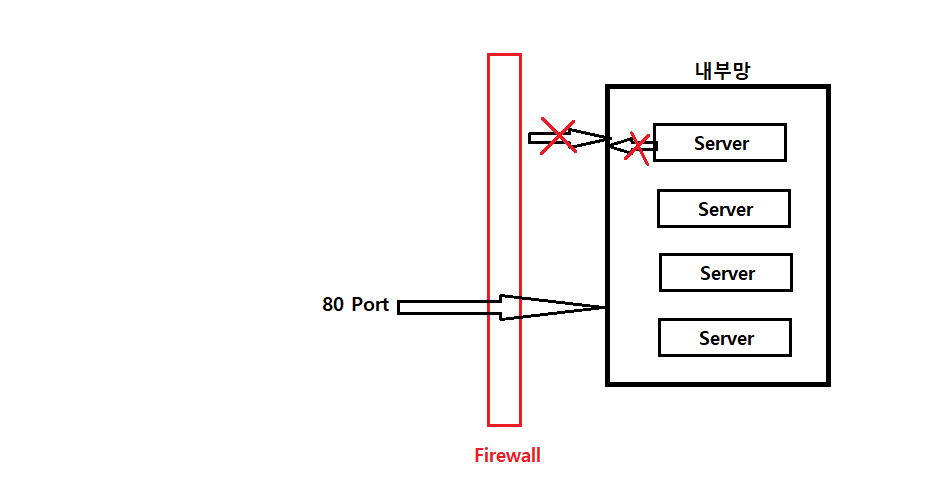 아래 그림과 같이 Intranet이라는 내부망에 서버들을 구축해 놓는다. 이렇게 서버를 구축해 놓았을 경우 외부로 부터 요청을 받을 수도 없고 밖으로 내보낼 수도 없다. 외부로 부터 요청을 받기 위해서는 Firewall이라는 방화벽을 통해 Port를 열어 놓고 해당 Port를 가진 요청만 들어갈 수 있도록 허용한다는 개념이다.